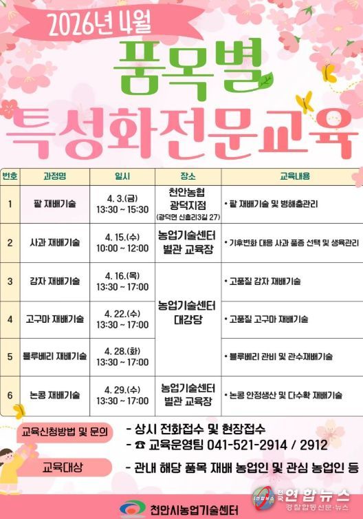 전국연합뉴스 김대환 기자 | 천안시농업기술센터는 내달 3~ 29일 ‘품목별 특성화 전문교육’을 운영한다고 23일 밝혔다.