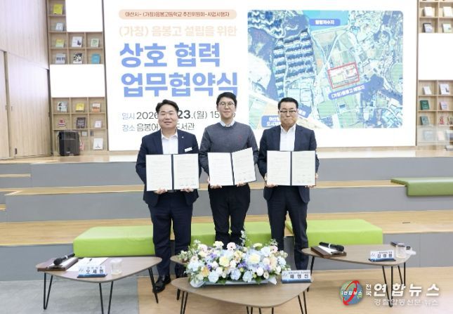 아산시는 23일 음봉 어울샘도서관에서 (가칭)음봉고등학교 추진위원회, 사업시행자인 ㈜탕정어센트와 함께 ‘음봉고 적기 추진을 위한 공동협력 업무협약’을 체결했다.