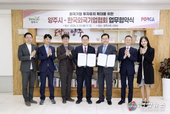 전국연합뉴스 박점규 기자 | 양주시가 지난 23일 시장실에서 외국기업 투자유치 확대를 위해 양주시와 한국외국기업협회(회장 문고영) 간 업무협약을 체결했다.