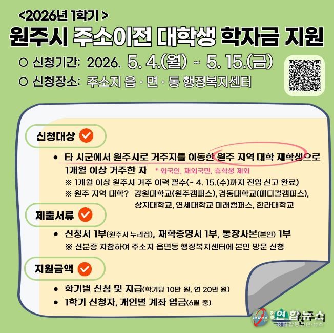 전국연합뉴스 유근택 기자 | 원주시는 전입신고를 마치고 원주시민이 된 대학생에게 상·하반기 각 10만 원씩 연간 20만 원의 학자금을 지원한다.
