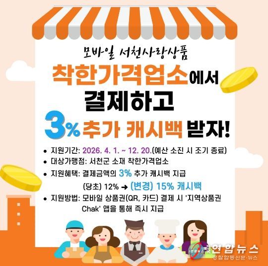 전국연합뉴스 김대환 기자 | 서천군은 고물가로 인한 군민 생활비 부담을 덜고 지역 소상공인과의 상생을 도모하기 위해 오는 4월 1일부터 12월 20일까지 ‘착한가격업소 모바일 서천사랑상품권 추가 지원사업’을 시행한다.