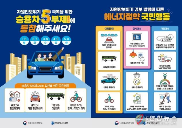 정부가 주도하는 공공기관 승용차 5부제는 이날부터 의무 시행된다. 중앙정부와 지방자치단체, 정부 산하 공공기관, 지자체 공공기관, 국공립대, 국립병원, 시도교육청 등이 대상이다.