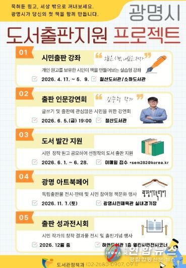 전국연합뉴스 조민준 기자 | 광명시가 시민의 창작 활동을 지원하고 지역 기반의 출판 문화를 활성화하기 위해 ‘2026년 광명시 도서출판지원 프로젝트’를 추진한다.