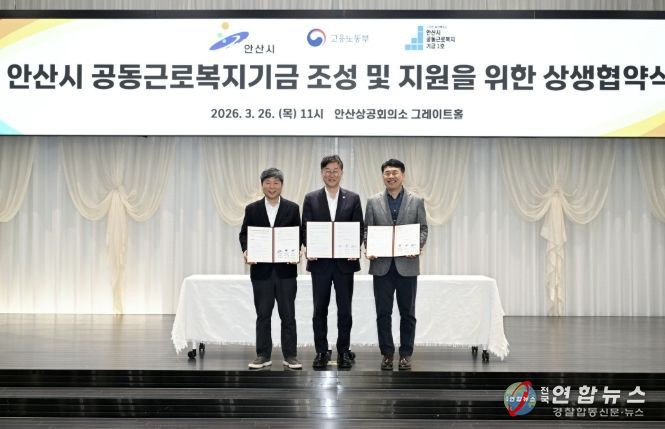 전국연합뉴스 이명후 기자 | 안산시는 지난 26일 안산상공회의소 그레이트홀에서 경기지방고용노동청 안산지청, 안산시 공동근로복지기금 1호 법인과 함께 ‘안산시 공동근로복지기금 조성 및 지원을 위한 상생협약’을 체결했다고 27일 밝혔다.
