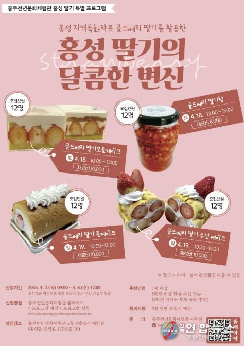 전국연합뉴스 김용태 기자 | 홍성군 홍주천년문화체험관은 오는 4월 18일부터 19일까지 이틀간, 지역특화작목인 골드베리 딸기를 활용한 특별 프로그램을 운영한다고 밝혔다.