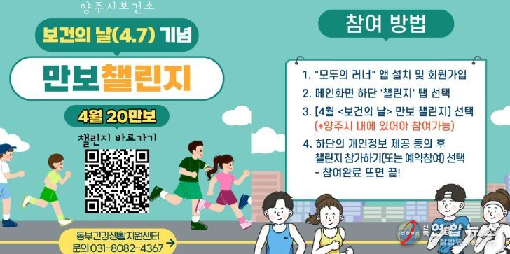 전국연합뉴스 박점규 기자 | 양주시보건소 동부 건강생활지원센터에서는 ‘제54회 보건의 날’을 기념해 지역 주민의 건강 생활 실천을 유도하기 위한 2026년도 ‘보건의 날(4.7) 기념 만보 챌린지’ 참여자를 모집한다.