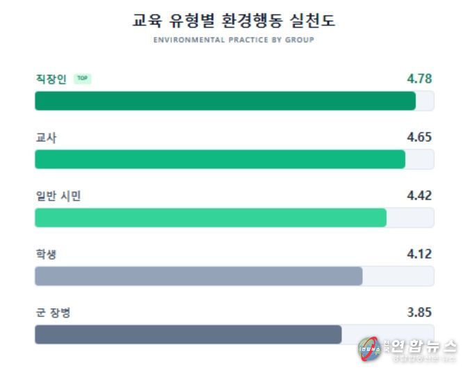 교육 대상별로는 직장인이 4.78점으로 가장 높은 실천도를 보였고, 교사 4.65점, 일반 시민 4.42점 순이었다. 학생은 4.12점, 군 장병은 3.85점에 그쳤다.