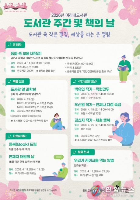 전국연합뉴스 유근택 기자 | 원주시 미리내도서관은 2026년 도서관 주간 및 책의 날을 기념해 4월 11일부터 25일까지 ‘도서관 속 작은 펼침, 세상을 여는 큰 열림’을 주제로 다채로운 문화 프로그램을 선보인다.