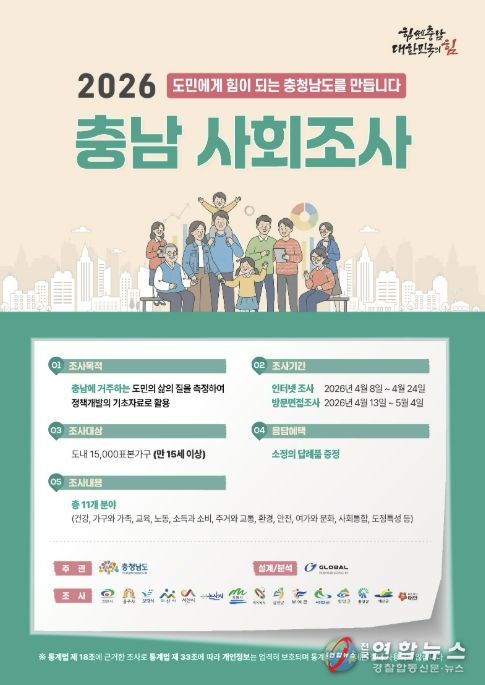 전국연합뉴스 김용태 기자 | 예산군은 군민의 삶의 질과 사회 전반에 대한 인식을 파악하기 위해 표본으로 선정된 900가구를 대상으로 인터넷 및 방문조사를 병행하는 ‘2026년 충남 사회조사’를 실시한다고 밝혔다.