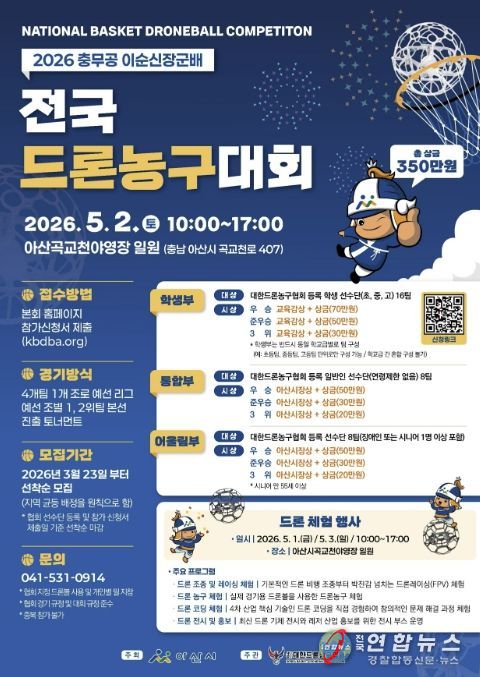 전국연합뉴스 김용태 기자 | 아산시는 오는 5월 2일 아산 곡교천 야영장 일원에서 ‘2026 충무공 이순신장군배 전국 드론농구대회’를 개최하고, 참가팀 모집에 나선다고 밝혔다.