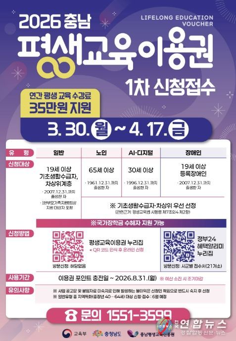 신청 대상은 주민등록 기준 충남 내 주소를 둔 19세 이상 성인으로 △기초생활수급자 △차상위계층(한부모가족지원법 지원 대상자 포함, 2007년 12월 31일 이전 출생자) △노인(65세 이상, 1961년 12월 31일 이전 출생자) △AI·디지털 분야(30세 이상, 1996년 12월 31일 이전 출생자) △19세 이상 등록장애인(2007년 12월 31일 이전 출생자)이다.