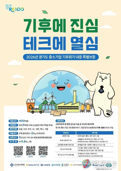 경기도는 도내 기업들의 저탄소 전환을 돕고 기후위기 대응 경쟁력을 근본적으로 강화하기 위해 ‘2026년 중소기업 기후위기 대응 특별보증’ 금융 지원을 본격 추진한다고 7일 밝혔다.