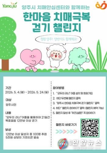 이번 행사는 비대면 방식으로 진행되며, 모바일 앱 ‘모두의 러너’를 통해 참여할 수 있다. 앱 내 ‘챌린지’ 탭에서 ‘양주시 한마음 치매극복 걷기 챌린지’를 선택한 뒤 참여 버튼을 누르면 신청이 완료되며, 사전 예약도 가능하다.