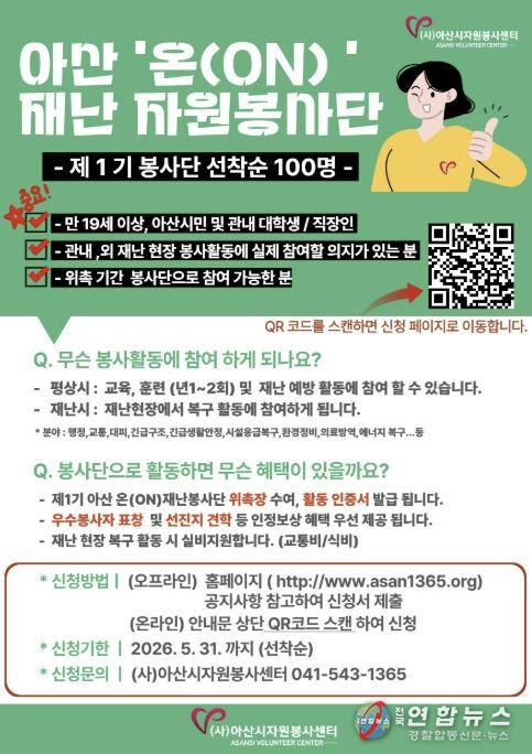 전국연합뉴스 김용태 기자 | 아산시는 5월 31일까지 ‘제1기 아산 온(ON) 재난봉사단’에 참여할 자원봉사자 100명을 모집한다고 밝혔다.