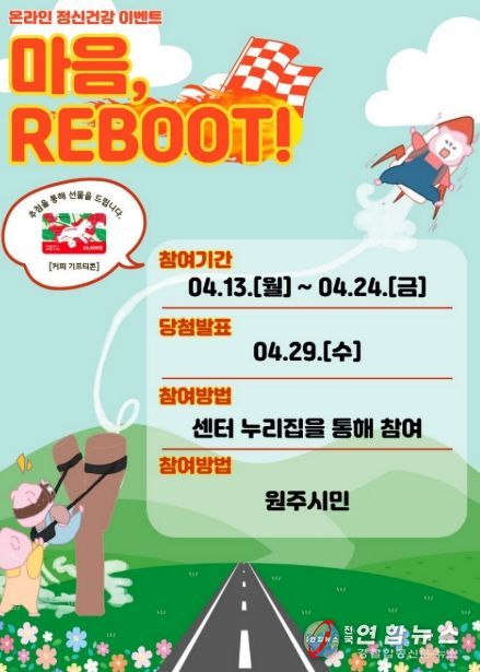 전국연합뉴스 유근택 기자 | 원주시정신건강복지센터는 온라인 정신건강 이벤트‘마음, REBOOT’를 오는 4월 13일부터 4월 24일까지 진행한다.