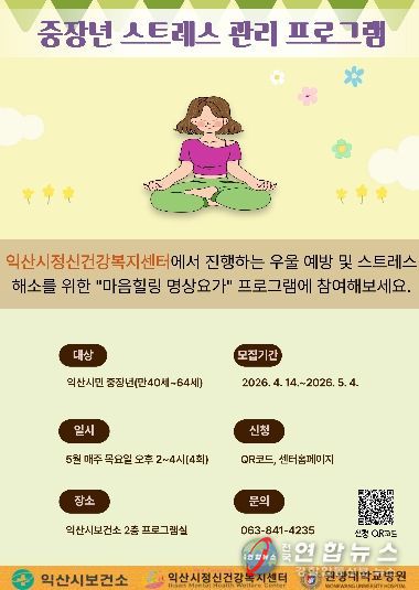익산시정신건강복지센터는 만 40~64세 중장년을 대상으로 '마음힐링 명상요가' 프로그램을 운영한다고 13일 밝혔다.