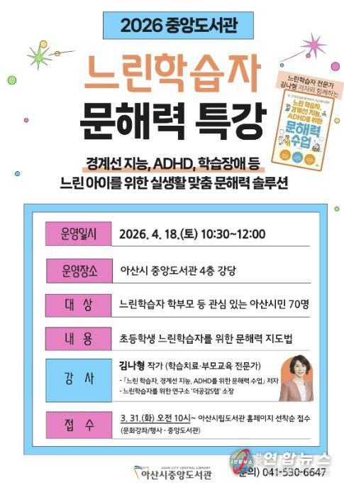전국연합뉴스 김용태 기자 | 아산시 중앙도서관은 오는 18일(토) 오전 10시 30분부터 12시까지 중앙도서관 4층 강당에서 '느린학습자 문해력 특강'을 운영한다.
