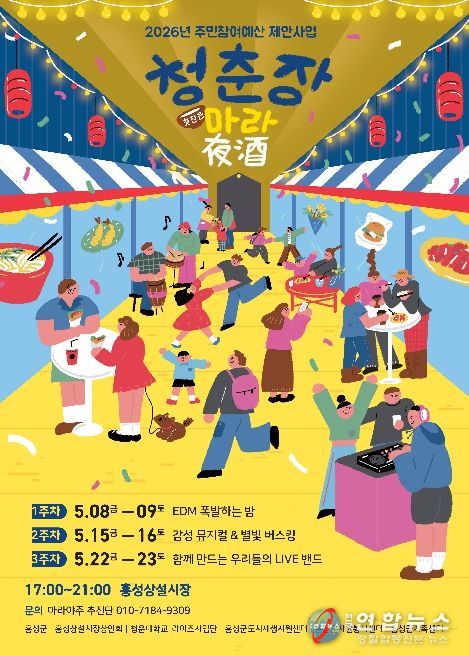 홍성군은 오는 5월 8일부터 23일까지 3주간 매주 금요일과 토요일에 홍성상설시장에서 주민참여예산 사업인 ‘청춘장 in 홍성상설시장’을 운영한다고 밝혔다.