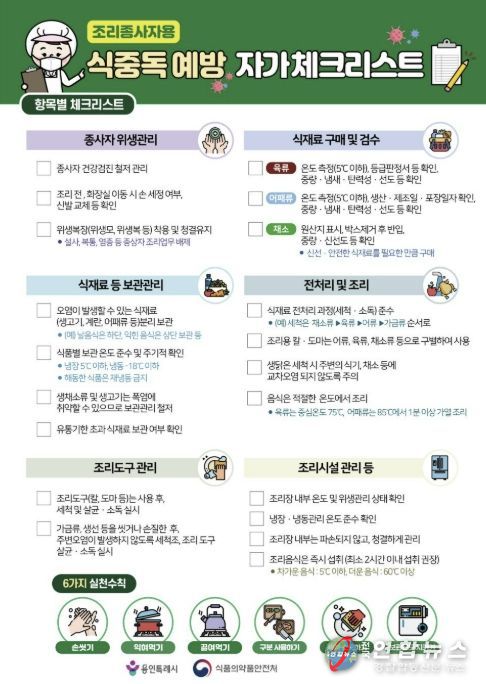 또 칼과 도마는 어류‧육류‧채소류 등으로 구별해 쓰고, 사용한 칼과 도마 등은 반드시 세척‧소독해야 한다고 했다. 조리한 음식은 최소 2시간 이내에 먹을 것도 권장했다.