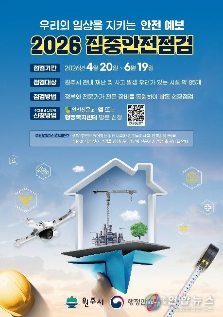 전국연합뉴스 유근택 기자 | 원주시는 4월 20일부터 6월 19일까지 61일간 ‘2026년 집중안전점검’을 추진한다.