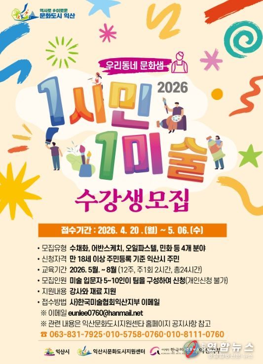 시는 익산시문화도시지원센터와 함께 오는 20일부터 5월 6일까지 '1시민 1미술'에 참여할 25팀을 모집한다.