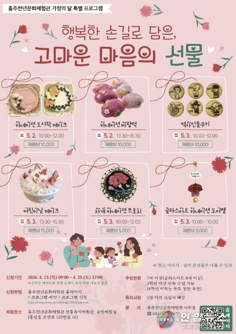 전국연합뉴스 김용태 기자 | 홍성군 홍주천년문화체험관은 가정의 달을 맞아 오는 5월 2일부터 3일까지 이틀간 특별 프로그램 “행복한 손길로 담은 고마운 마음의 선물”을 운영한다.