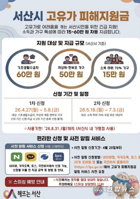 전국연합뉴스 김용태 기자 | 충남 서산시가 유가 상승으로 인한 시민의 부담을 줄이기 위해 ‘고유가 피해 지원금’ 지급에 행정력을 집중한다.