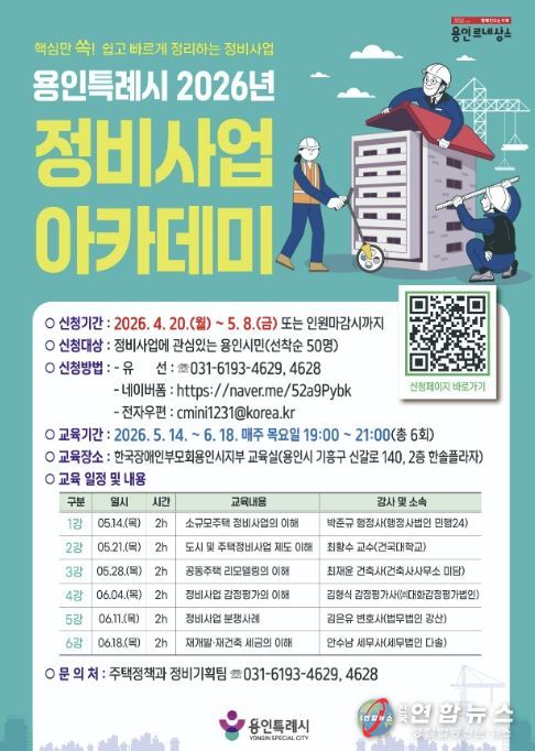 전국연합뉴스 기자 | 용인특례시는 4월 20일부터 5월 8일까지 ‘2026년 정비사업 아카데미’ 수강생을 모집한다.
