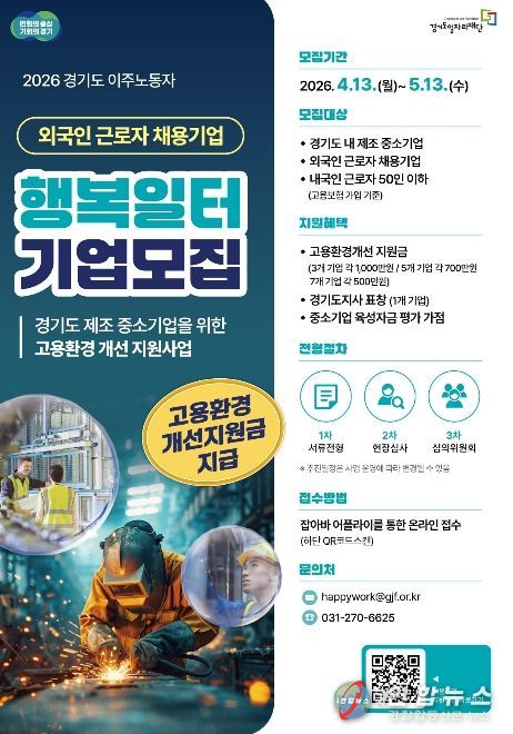 전국연합뉴스 조민준 기자 | 경기도와 경기도일자리재단은 도내 외국인 근로자를 고용한 중소 제조기업을 대상으로 ‘2026년 경기도 이주노동자 행복일터 선정사업’ 참여기업을 모집한다고 20일 밝혔다.