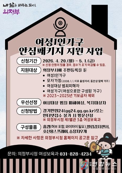 전국연합뉴스 박점규 기자 | 의정부시는 4월 20일부터 5월 1일까지 12일간 온․오프라인을 통해 여성 1인 가구 안심패키지 지원사업의 신청을 접수한다.