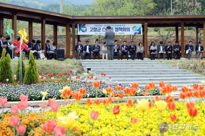 전국연합뉴스 김현호 기자 | 전북 고창군이 20일 봄꽃이 만개한 꽃정원에서 스마트정책회의(간부회의)를 열고 “꽃정원을 주민여가 공간과 체류형 관광의 핵심으로 만들겠다”고 강조했다.
