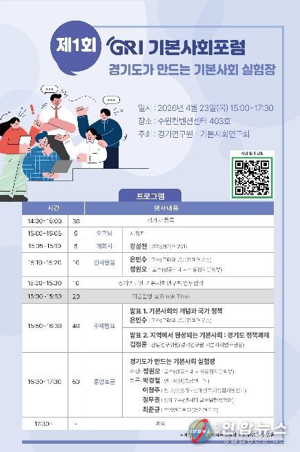 전국연합뉴스 조민준 기자 | 경기연구원은 오는 23일 오후 3시 수원컨벤션센터 403호에서 ‘경기도가 만드는 기본사회 실험장’을 주제로 ‘제1회 GRI 기본사회포럼’을 개최한다.