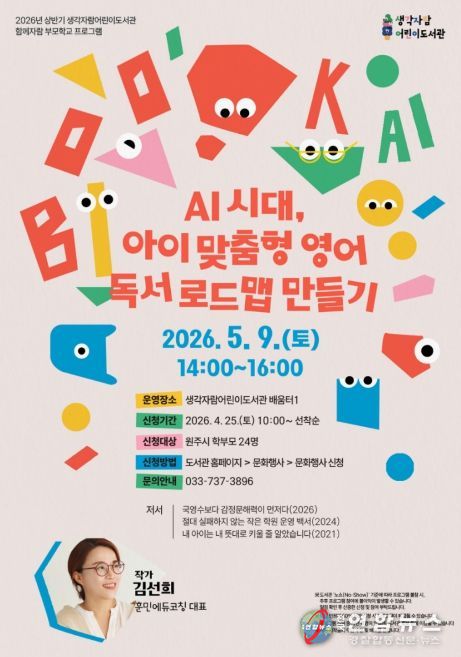 전국연합뉴스 유근택 기자 | 원주시 생각자람어린이도서관은 다음 달 9일 오후 2시, ‘AI 시대, 아이 맞춤형 영어 독서 로드맵 만들기’를 주제로 5월 ‘함께자람 부모학교’ 프로그램을 운영한다.