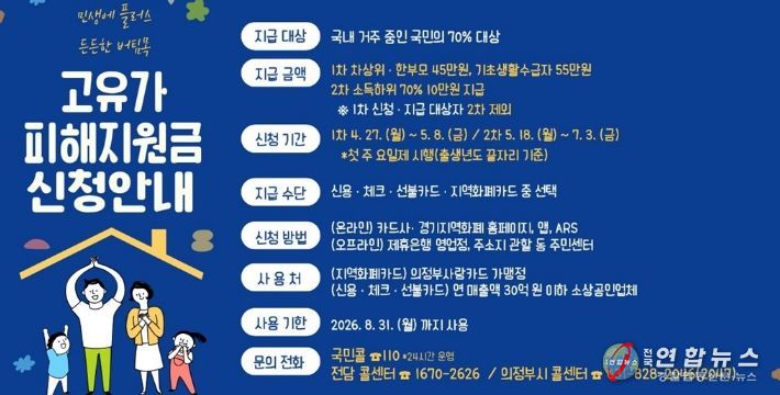 전국연합뉴스 박점규 기자 | 의정부시는 중동전쟁으로 촉발된 고유가‧고물가로 인한 국민 부담을 경감하고자 ‘고유가 피해지원금’ 신청을 4월 27일부터 접수한다.
