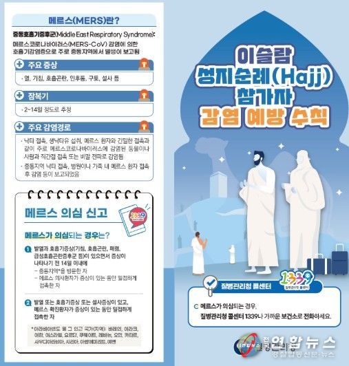 시는 성지순례 기간을 앞두고 사우디아라비아 방문객 증가가 예상됨에 따라 메르스(MERS)와 수막구균 감염증 등 감염병 예방을 위한 개인위생 관리에 각별한 주의가 필요하다고 22일 밝혔다.
