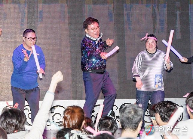 반짝이 옷을 입은 진 구청장은 조승아 강서장애인가족지원센터장, 장애인 등 6명과 무대에 올라 함께 춤을 추며 소통했다.