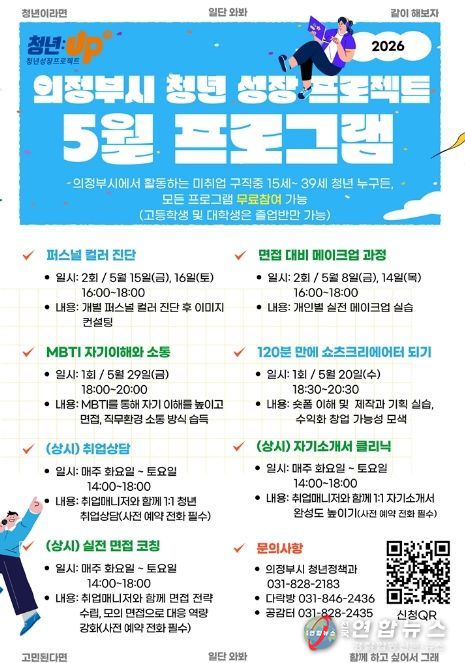 전국연합뉴스 박점규 기자 | 의정부시는 미취업 청년의 취업 준비 역량 강화를 위해 ‘청년성장프로젝트’ 5월 프로그램을 운영한다.
