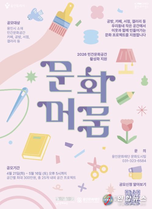전국연합뉴스 기자 | 용인문화재단은 오는 5월 16일까지 ‘민간문화공간 활성화 지원사업 '문화머뭄'’의 참여 공간을 모집한다고 밝혔다. 지난해 25개소 공간에서 203회의 프로그램을 운영하며 2,101명의 시민 참여를 이끌어낸 ‘문화머뭄’ 사업은 올해 재단 자체 재원을 매칭하여 총 25개소의 민간문화공간을 선정하고, 공간별 최대 300만 원까지 프로젝트 운영비를 지원할 예정이다.