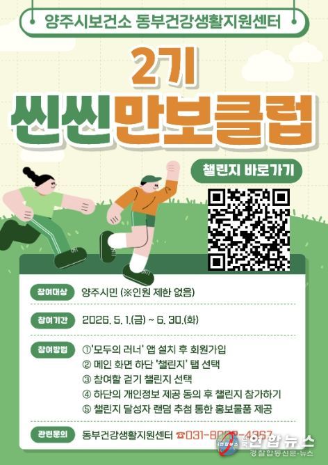 전국연합뉴스 박점규 기자 | 양주시보건소 동부 건강생활지원센터에서 지역 주민의 건강생활실천율 향상과 비만율 개선을 위해 ‘2026년도 씬씬 만보클럽 2기’ 참여자를 모집한다.
