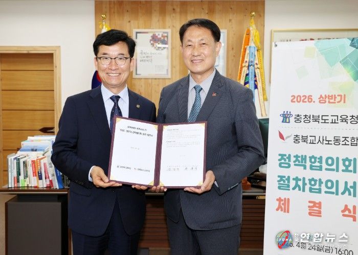 전국연합뉴스 기자 | 충청북도교육청은 24일 오후 4시, 교육감 집무실에서 충북교사노동조합(위원장 유윤식)과 '2026. 상반기 정책협의회 절차합의서'를 체결했다.