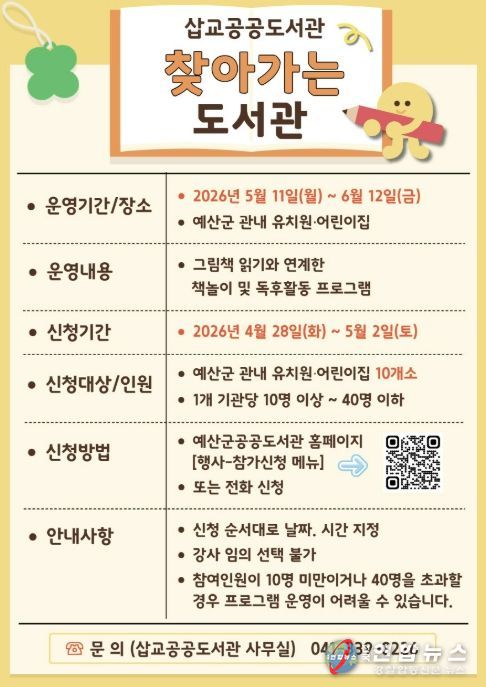 전국연합뉴스 김용태 기자 | 예산군 삽교공공도서관은 5월 11일부터 6월 12일까지 관내 유치원·어린이집을 대상으로 ‘찾아가는 도서관’ 프로그램을 운영한다.