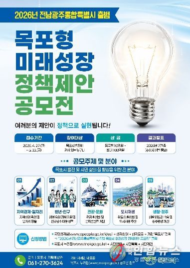 전국연합뉴스 김철환 기자 | 목포시가 전남·광주 통합특별시 출범에 대비하고 지역의 미래 성장동력을 발굴하기 위해 ‘목포형 미래성장 정책제안 공모전’을 개최한다.