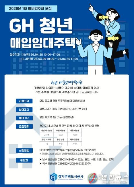 전국연합뉴스 조민준 기자 | 경기주택도시공사(GH)가 청년층 주거 부담을 덜고 안정적인 생활 기반을 마련할 수 있도록 청년 및 자립준비 청년을 위한 매입임대주택 예비입주자 396명을 모집한다고 27일 밝혔다.