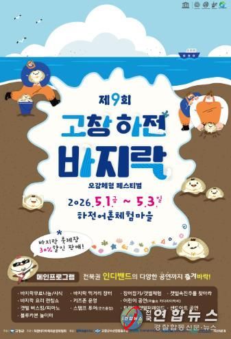전국연합뉴스 김현호 기자 | 고창군이 오는 5월1~3일 심원면 하전어촌체험마을 일원에서 ‘제9회 하전바지락 오감체험 페스티벌’을 개최한다고 밝혔다.