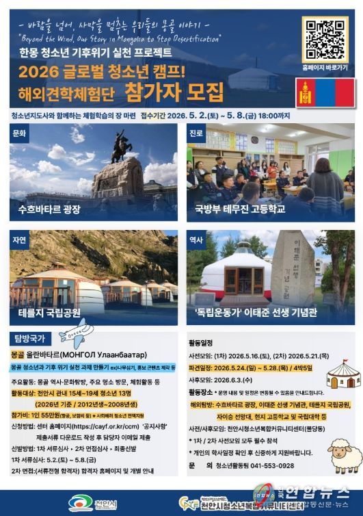 전국연합뉴스 김대환 기자 | 천안시청소년재단 산하 천안시청소년복합커뮤니티센터가 청소년의 글로벌 역량 강화를 위해 ‘2026 청소년 국제교류 캠프’ 몽골 탐방 참가자를 모집한다.