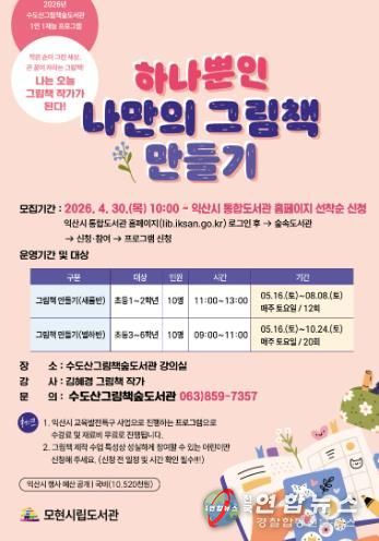 익산시 수도산그림책숲도서관은 오는 5월 16일부터 초등학생을 대상으로 '하나뿐인 나만의 그림책 만들기' 수업을 운영한다.