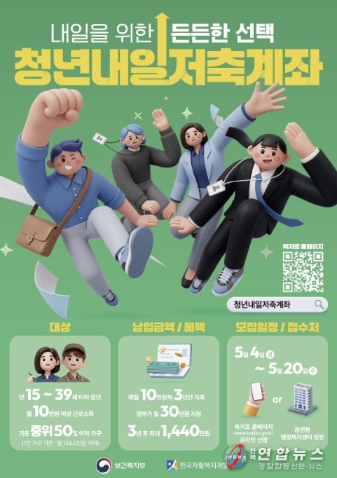 청년내일저축계좌는 5월 4일부터 5월 20일까지 신규 가입자를 모집하며, 지원 대상은 기준 중위소득 50% 이하(차상위 이하) 가구의 만 15세 이상부터 만 39세 이하의 일하는 청년으로, 현재 근로활동 중이며 월 근로·사업소득이 10만 원 이상이어야 한다.