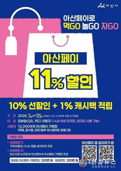 한편, 아산시는 중동 위기 등 대외 불확실성에 대응하기 위해 지난 3월 16일부터 시행한 아산페이 20% 할인 정책이 시민들의 높은 호응 속에 당초 계획보다 5일 앞선 4월 10일 조기 종료한 바 있다. 시는 20% 할인 종료 이후에도 서민경제 지원을 위해 11% 할인율을 유지하고 있으며, 이를 통해 시민의 생활비 부담 완화와 전통시장·소상공인 가맹점의 매출 증대를 동시에 도모하고 있다.