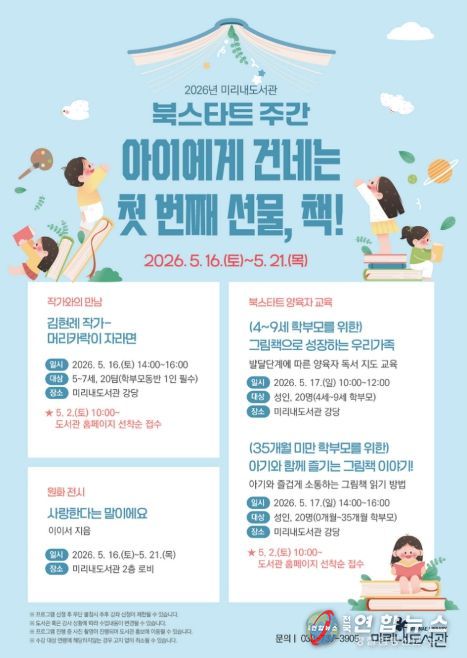 전국연합뉴스 유근택 기자 | 원주시 미리내도서관은 다음 달 16일부터 21일까지 북스타트코리아와 함께 ‘아이에게 건네는 첫 번째 선물, 책!’을 주제로 북스타트 주간 프로그램을 운영한다.