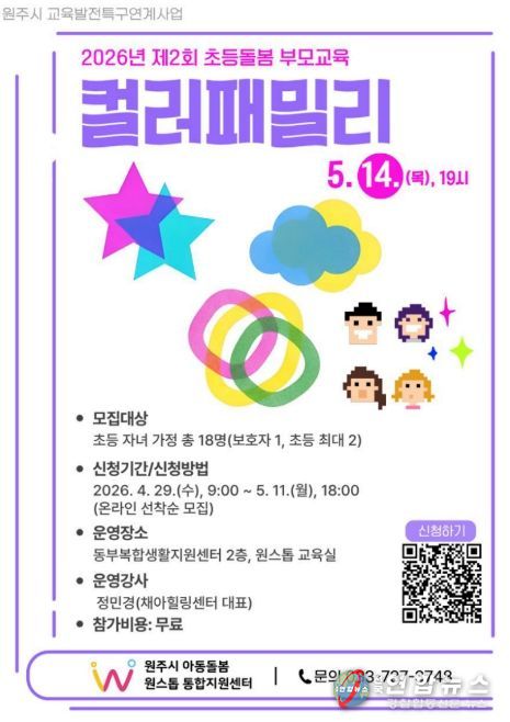 전국연합뉴스 유근택 기자 | 원주시 아동돌봄 원스톱통합지원센터는 다음 달 14일 오후 7시, 관내 초등학생 자녀와 보호자를 대상으로 가족 간의 이해와 소통을 돕는 부모교육 프로그램 ‘컬러패밀리’를 운영한다.